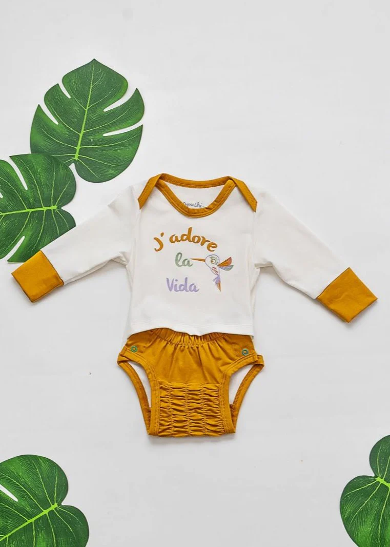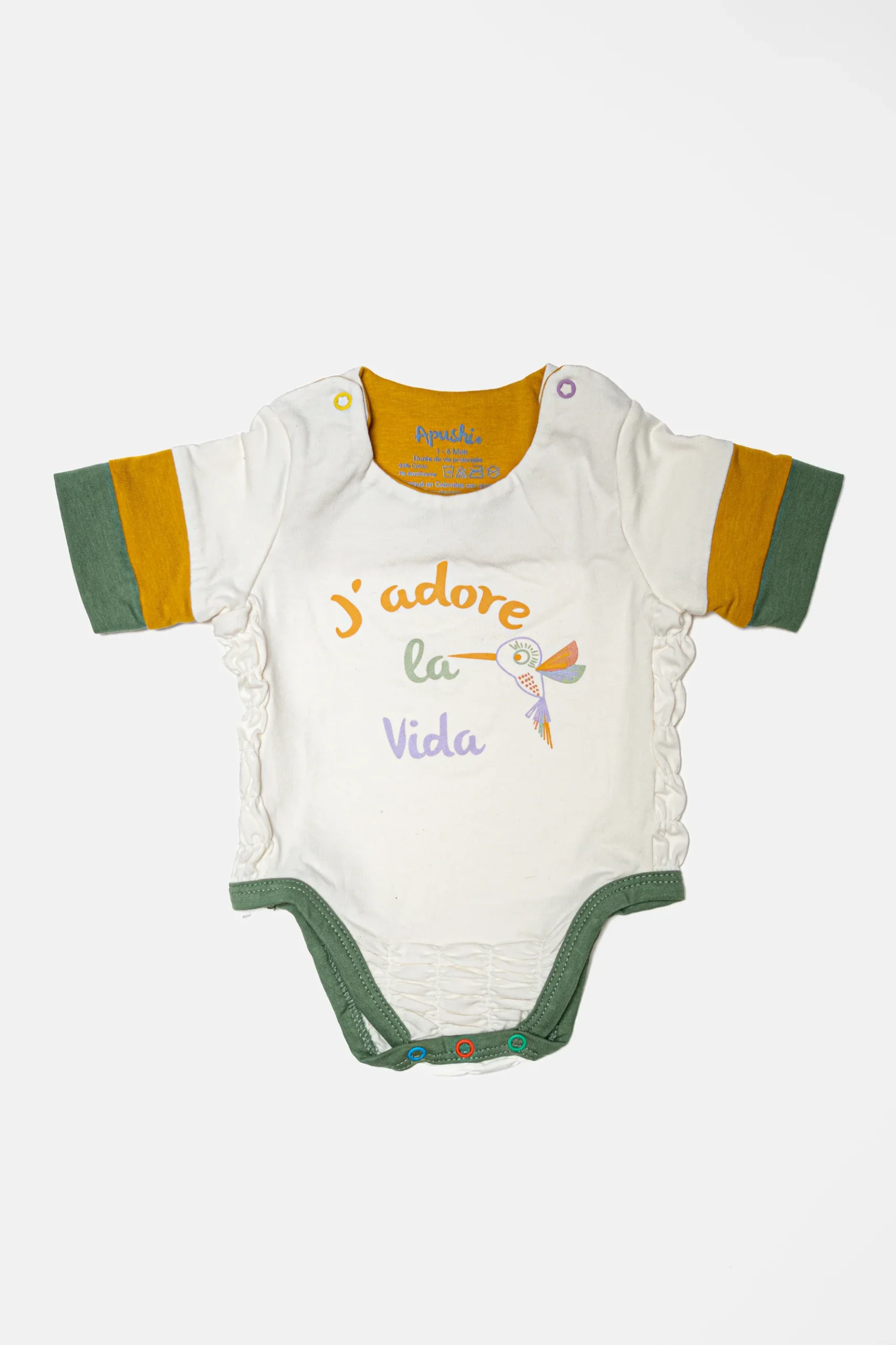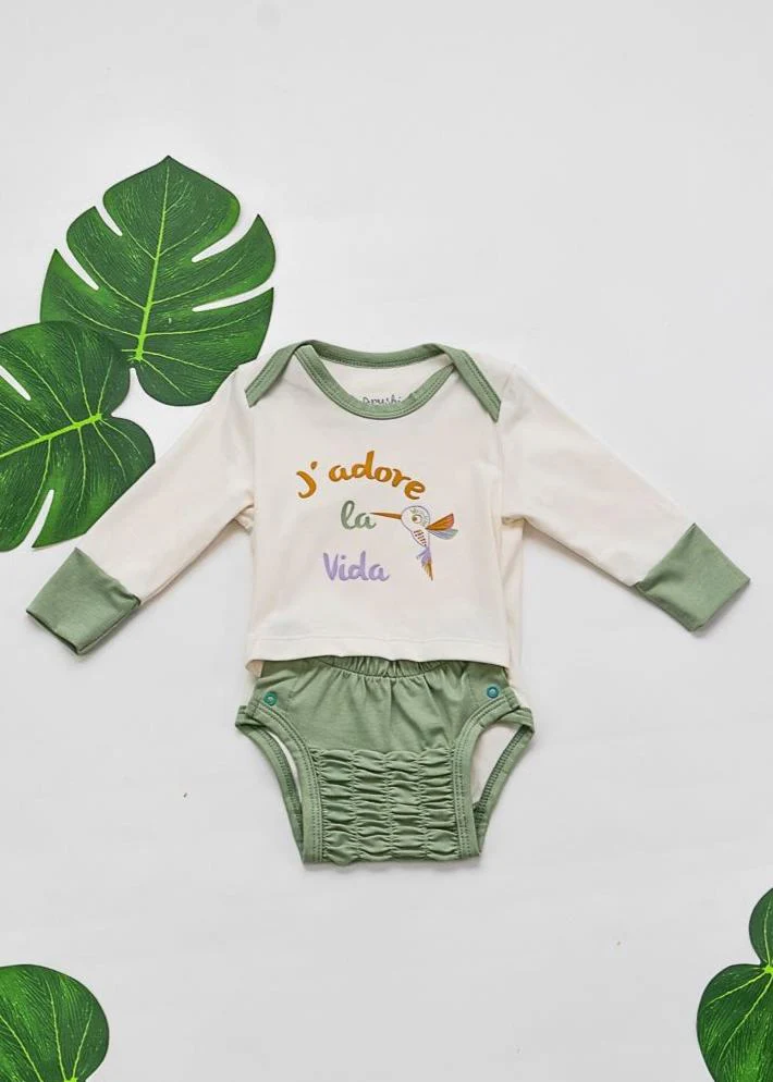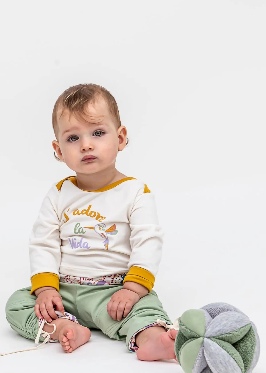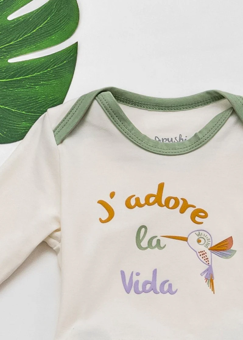 Orné de la phrase « J’adore la vida », ce body évolutif célèbre l’amour pour les moments authentiques. Avec son motif de colibri imprimé, il incarne la joie, le bonheur quotidien et la liberté. Disponible en trois couleurs tendance : Eucalyptus, Violette et Moutarde.