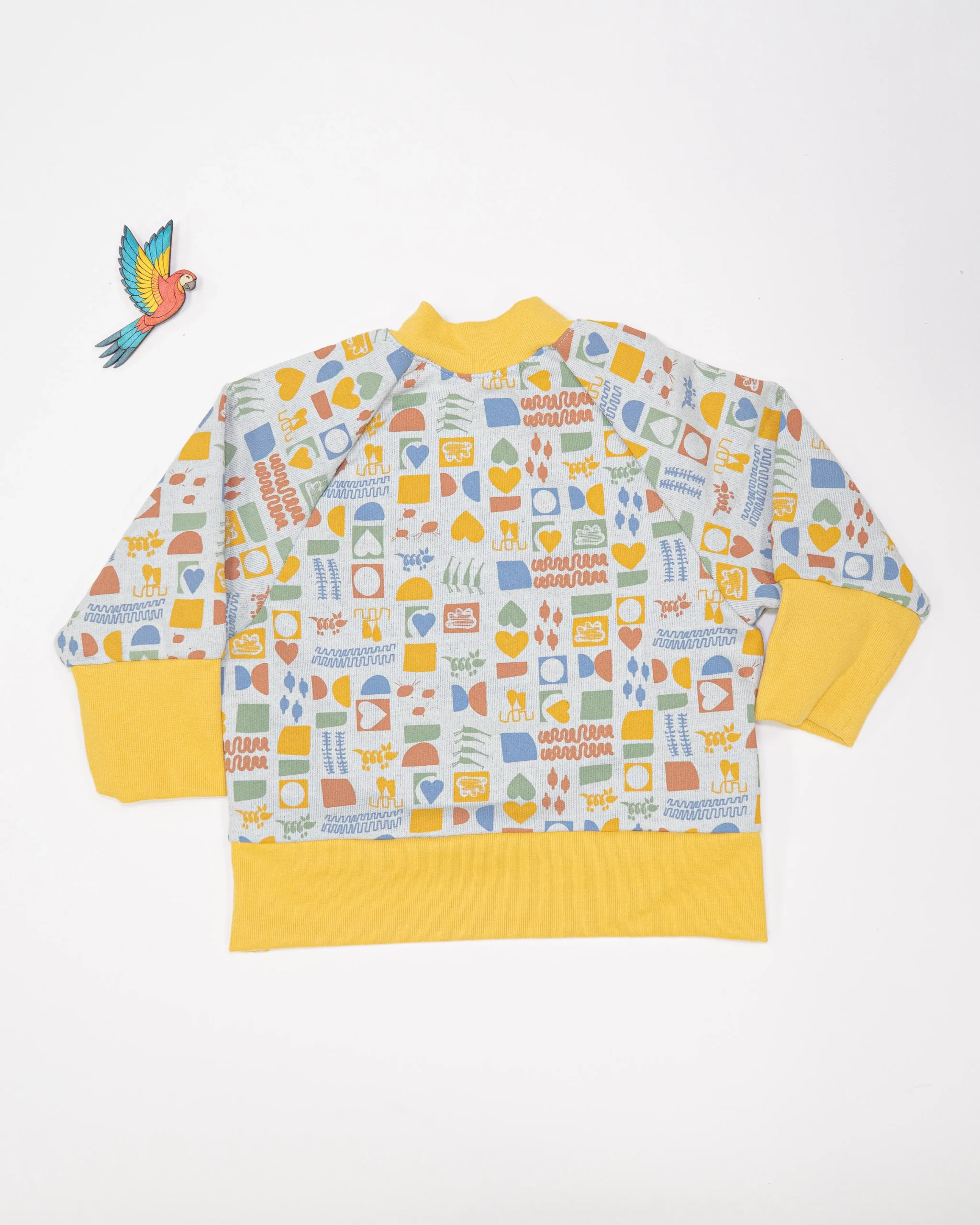 – ses pressions et zips astucieux qui dévoilent une pièce de tissu moutarde permettant d’agrandir la taille facilement.