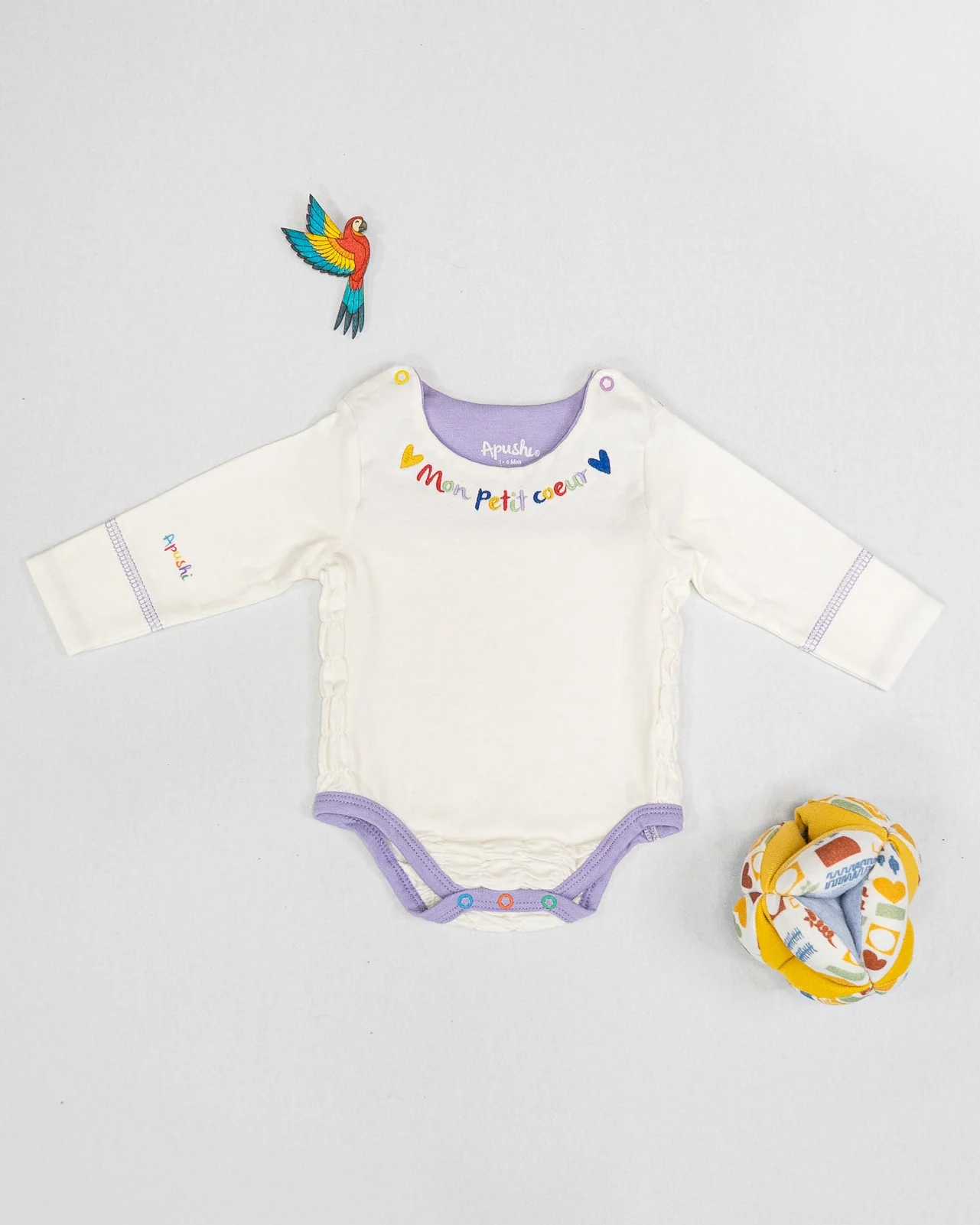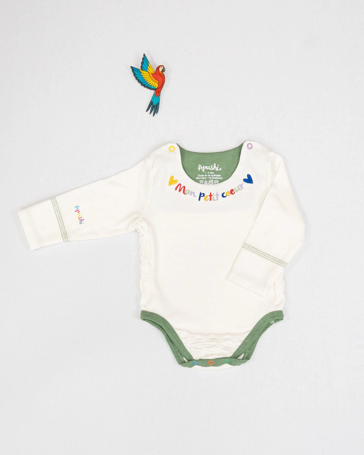 Le body Mi Corazoncito s’adapte parfaitement à la croissance de votre petit cœur, offrant un confort optimal pour favoriser la liberté de mouvement. Avec l’inscription délicate « Mon petit cœur » à l’avant et « Mi corazoncito » à l’arrière, ce body célèbre la multiculturalité de notre marque Apushi. Équipé de boutons-pression sur chaque épaule, il est facile à enfiler et à retirer.