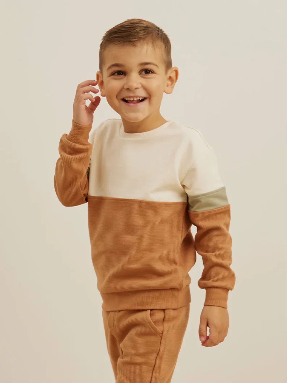 Un chandail doux en molleton avec un bas à texture ottoman. Ce vêtement à la coupe décontractée présente une teinte chaude pour ajouter une touche de couleur aux journées fraîches de l’automne. Avec ses poignets côtelés et son col rond, le chandail est parfait pour un habillage facile tous les jours. Agencez-le avec un jogging et créez un look assorti aux petits frères grâce à l’ensemble disponible dans la même gamme.