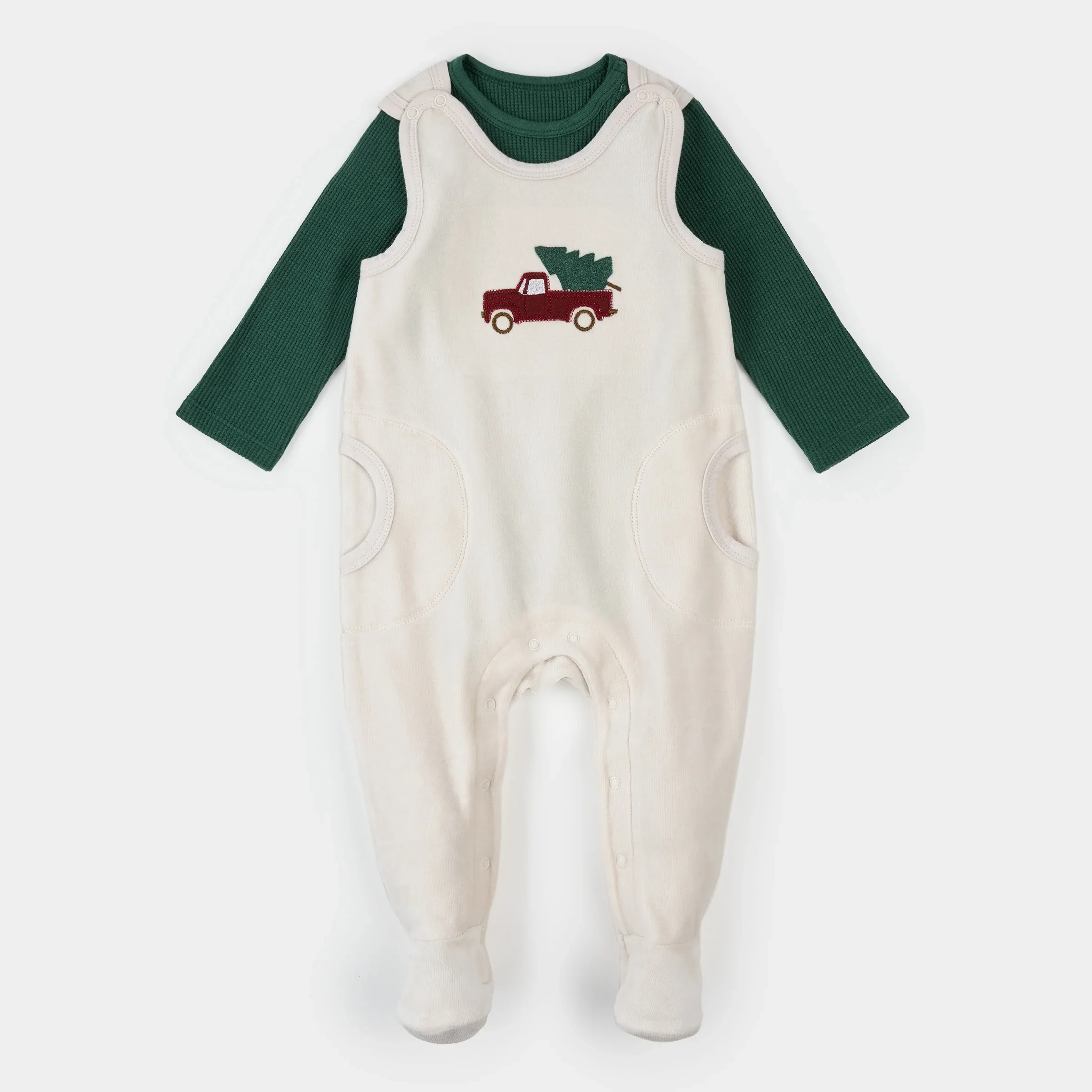 Cet ensemble festif comprend un cache-couche thermique et une salopette en velours doux avec un imprimé de camions des Fêtes. La salopette offre un ajustement douillet avec des pieds intégrés et des bretelles à boutons-pression pour faciliter l’habillage. C’est l’ensemble parfait pour garder bébé bien au chaud et confortable lors de vos sorties en famille avec la poussette.