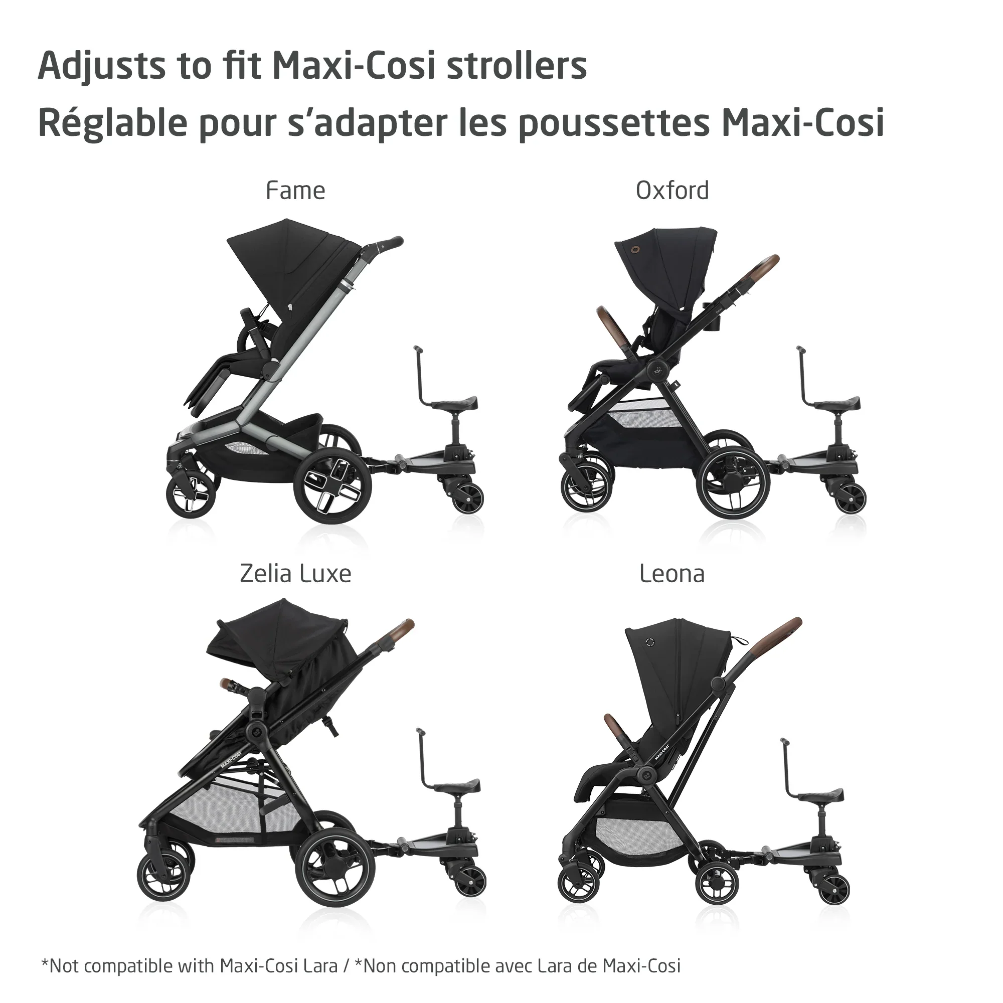 [COMPATIBLE AVEC LES POUSSETTES MAXI-Cosi] – La planche Hop-on est réglable en largeur, en longueur et en hauteur, ce qui la rend compatible avec presque toutes les poussettes Maxi-Cosi, à l’exception de la Lara.