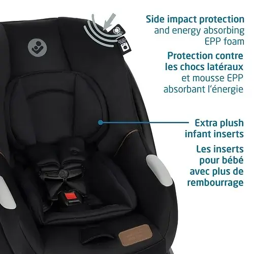 La protection contre les chocs latéraux et le coussin rembourré pour la tête et le dos amovible assurent un ajustement sûr et confortable.