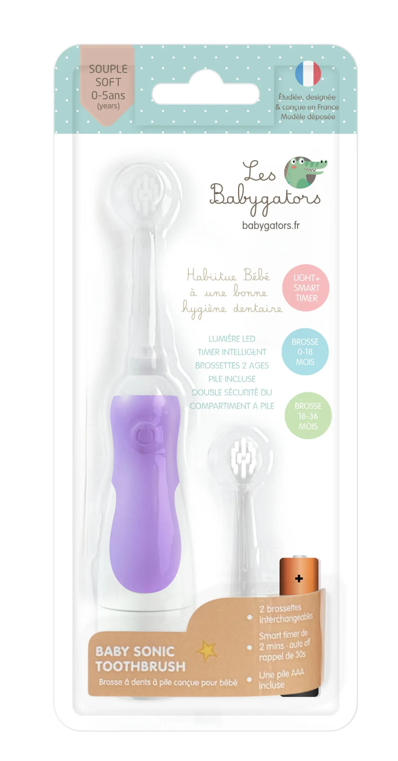Plus de détails : La première brosse à dents sonique (vibrante) spécialement conçue pour les dents de lait. Pour les bébés de 0 à 5 ans.