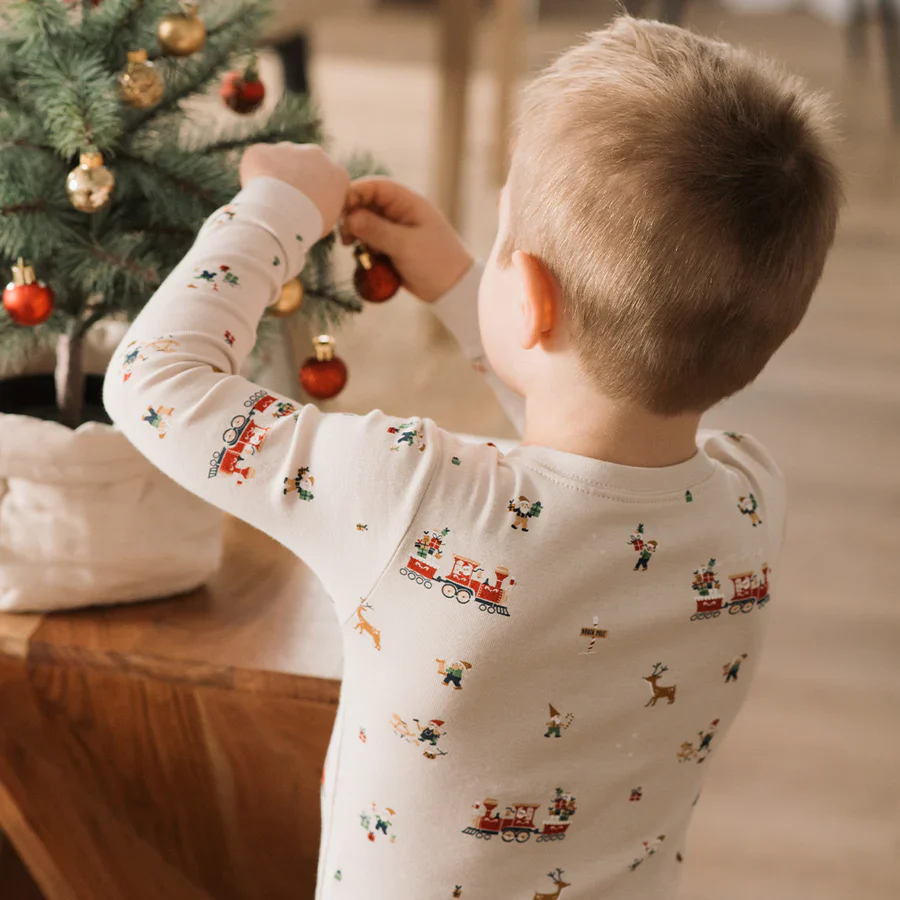 Entrez dans l’atelier du Père Noël avec cet ensemble pyjama bien douillet! Arborant un imprimé amusant inspiré de la caverne du père Noël, cet ensemble festif est fabriqué à partir de coton biologique tout doux. Les poignets et les chevilles côtelés gardent le froid à distance, tandis que la dormeuse assortie pour les plus jeunes rend l’ensemble parfait pour le réveillon de Noël.