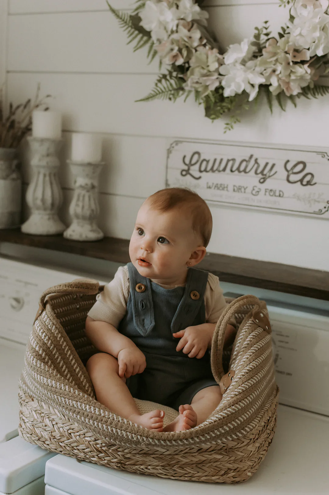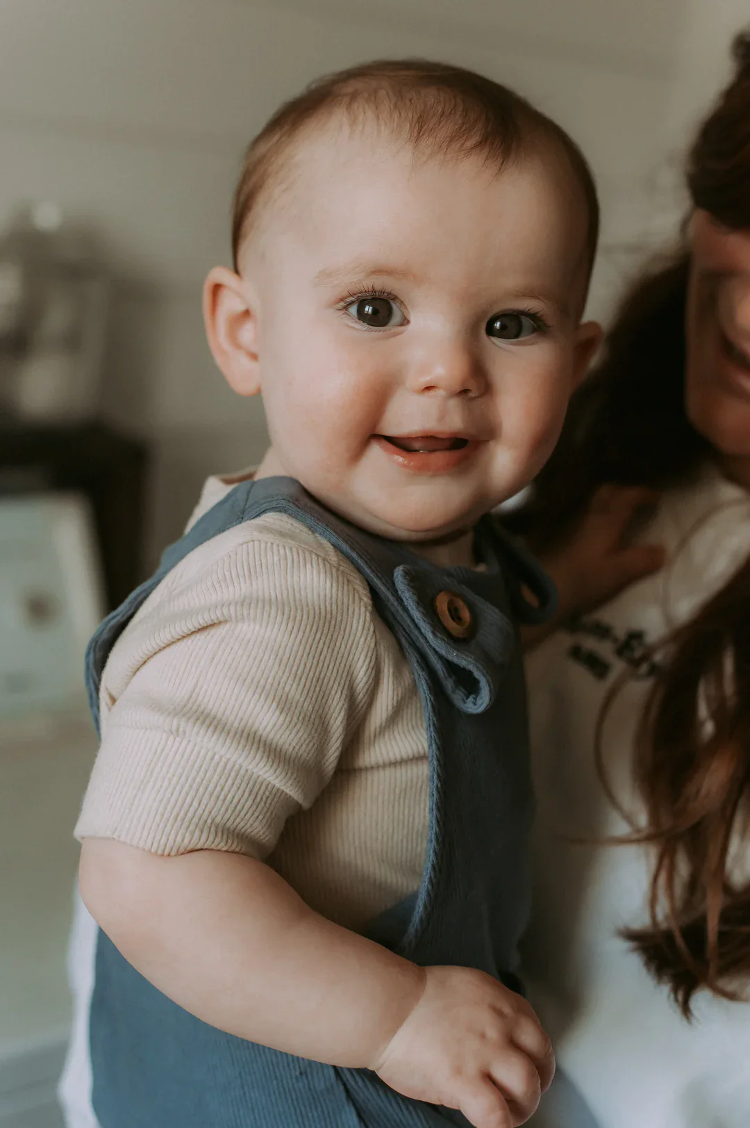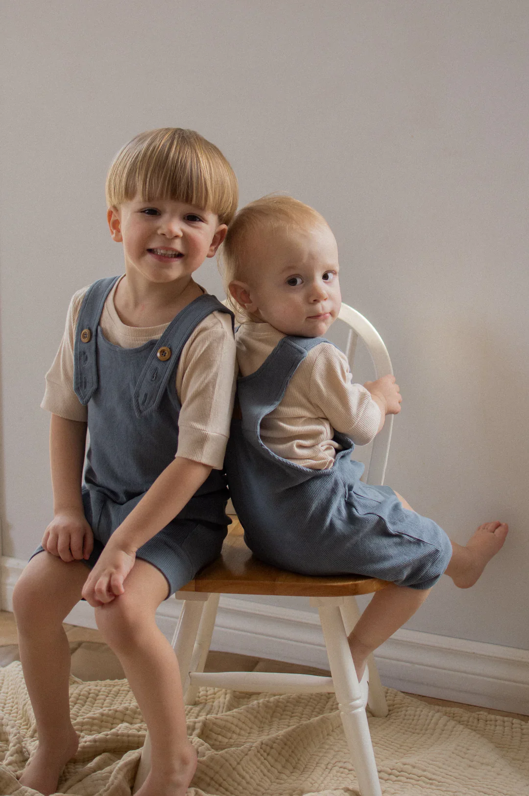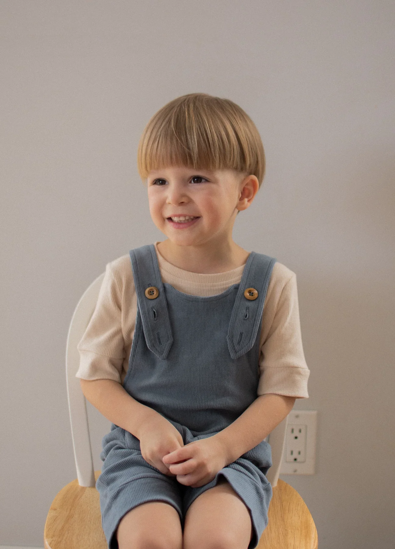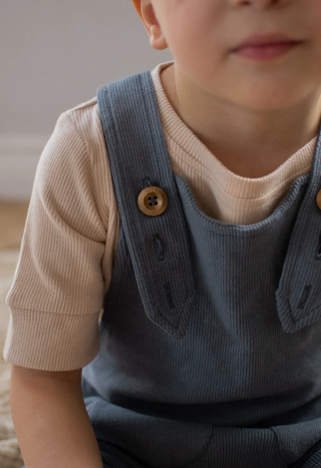 Soyez le premier à laisser votre avis sur “Salopette Évolutive Courte Bleu Pastel En Bambou Côtelé”