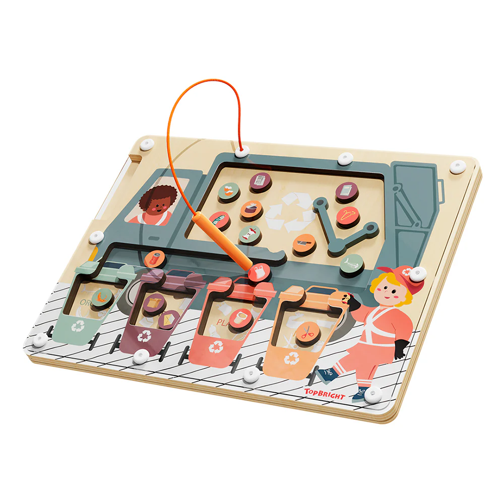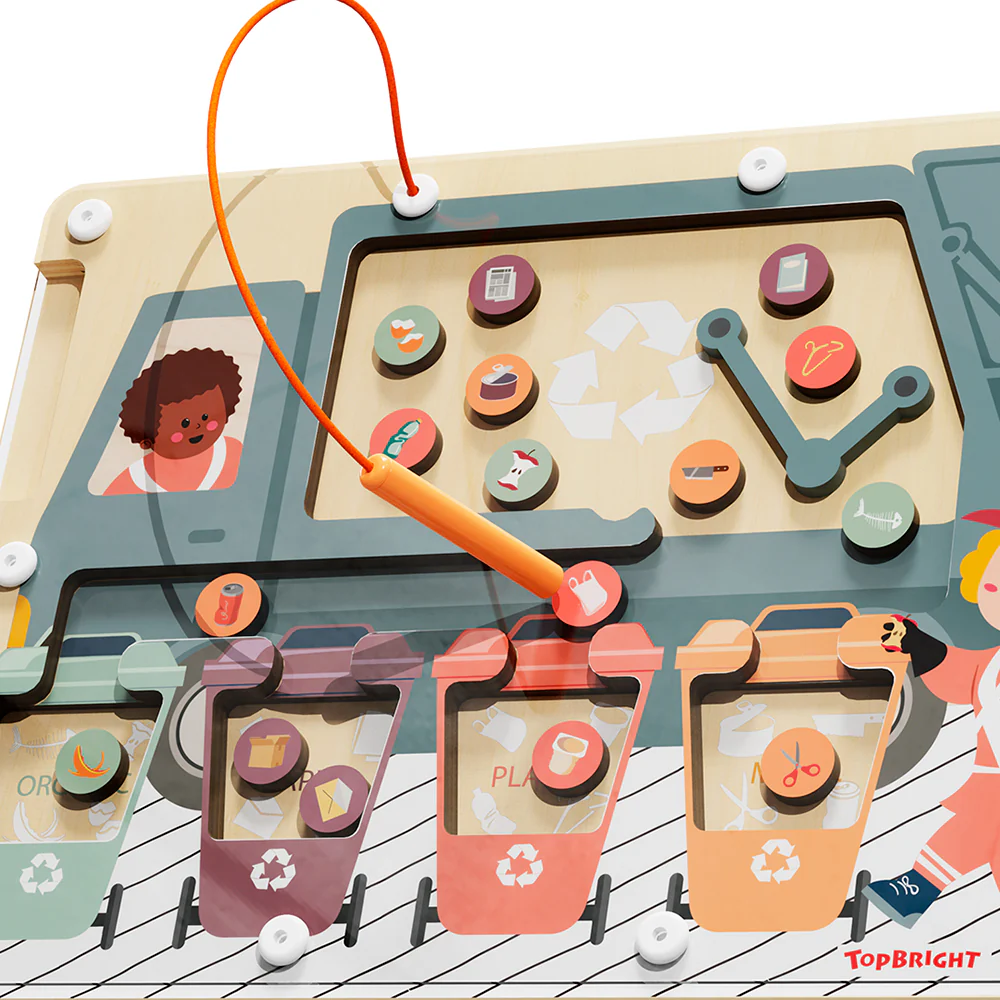 Avec le trieur de déchets magnétique, les enfants commenceront à apprendre les bases du recyclage. Métal, papier, plastique ou déchets organiques – les enfants trient les déchets individuels dans la bonne poubelle avec le stylo magnétique. Ce faisant, ils apprennent le recyclage ainsi que la protection de l’environnement. Le labyrinthe magnétique les encourage également à découvrir les couleurs de manière ludique.