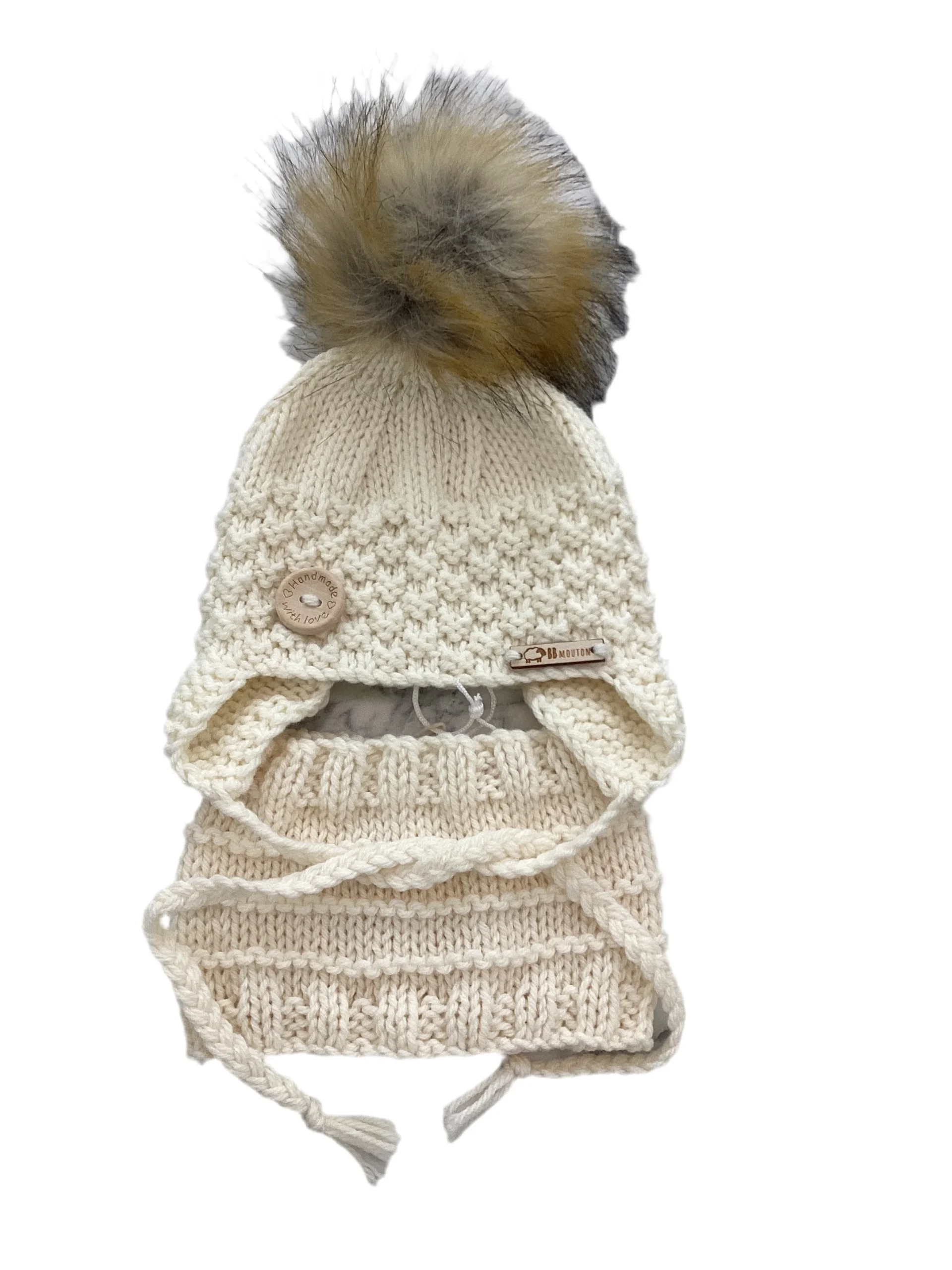 Cet ensemble comprend une tuque avec cache-oreilles et pompon amovible ainsi qu’un cache-cou. Entretien : Peut être lavé et séché à la machine (enlever le pompon)
