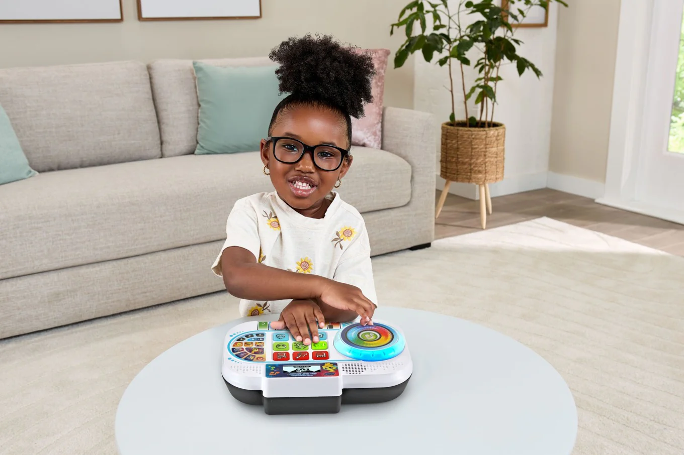 Explorez votre créativité avec vos amis musicaux et mélangez de nouvelles chansons avec des sons d’instruments, de personnages ou d’animaux. Faites tourner le plateau tournant lumineux, jouez du piano et réglez le tempo, puis enregistrez et sauvegardez jusqu’à deux minutes de musique. Chantez avec des chansons qui renforcent les lettres, les chiffres et les couleurs dans trois styles musicaux. Formons un groupe de musique! Choisissez parmi neuf amis musiciens pour former un trio et écoutez-les jouer ensemble. Jouez à un jeu de rythme en choisissant l’un des amis et en répétant le motif à l’écran pour les voir attraper des objets. C’est l’heure du spectacle! Conçu pour les 3-6 ans.